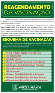 O secretário de Saúde de Várzea Grande, Gonçalo Barros, acrescentou que está ampliando para 10 Unidades Municipais de Saúde o atendimento com a vacinação para descentralizar o mesmo para todas as regiões de Várzea Grande e que o Reagendamento da Vacinação contra a COVID 19 visa resgatar aquelas pessoas que por qualquer motivo deixaram de receber a primeira, a segunda ou a dose de reforço que alguns chamam de terceira dose.
