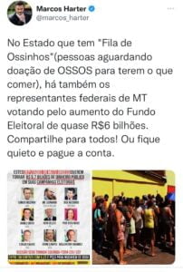 “No Estado que tem “Fila de Ossinhos”(pessoas aguardando doação de OSSOS para terem o que comer), há também os representantes federais de MT votando pelo aumento do Fundo Eleitoral de quase R$6 bilhões.” Essa é a indagação e reflexão do Médico Dr Marcos Harter, fez em seu twitter, com duas imagens publicadas. A primeira imagem das “filas de ossinhos” triste imagem de pessoas em total desalento social aguardando doação de ossos para comer, a outra imagem da bancada federal que votou pela derrubada do Veto Presidencial n.044/2021 e consequente aumento do Fundo Eleitoral para impressionantes R$5.7 bilhões de reais para as eleições de 2022. Apontado a falta de senso de prioridade e até mesmo sensibilidade social, Marcos Harter desabafa.