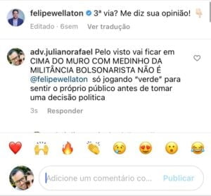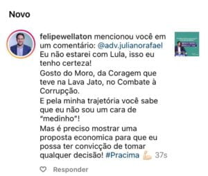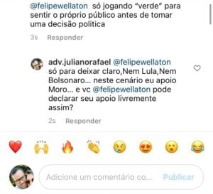Não satisfeito o internauta Juliano Rafael fez ainda um vídeo afirmando que Felipe Wellaton estava em cima do muro com a postagem e que estaria aguardando o melhor cenário eleitoral para posicionar-se. Ao final Juliano afirma: “Eu sou nem Lula, nem Bolsonaro e ARCO COM AS CONSEQUÊNCIAS DESTA POSTURA, EU SOU MORO NESSA QUESTÃO… NESSE CENÁRIO EM 2022 EU VOU APOIAR MORO, MAS EU POSSO FALAR LIVREMENTE, ARCANDO COM AS CONSEQUÊNCIAS E COMENTÁRIO NEGATIVOS, AS CRÍTICAS E OS ATAQUES E VOCÊ? PODE POSICIONAR-SE LIVREMENTE?