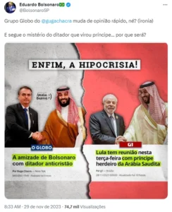 Eduardo comentou que o império de mídia brasileiro “muda de opinião rápido” ao mostrar uma imagem de Jair Bolsonaro e Lula cumprimentando o vice-príncipe herdeiro, Mohamed ben Salman, da Arábia Saudita. Na publicação com Bolsonaro, o jornal O Globo exibiu o título “A amizade de Bolsonaro com ditador anticristão”. Agora, com Lula, o mesmo Mohamed ben Salman deixa de ser ditador e recebe status de nobreza: “Lula tem reunião nesta terça-feira com príncipe herdeiro da Arábia Saudita”, publicou o portal G1.