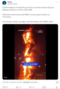“Um dia muito triste na nossa empresa. Lamentavelmente fomos surpreendidos com a notícia de que dois criminosos atearam fogo e destruíram uma das Estátuas da Liberdade da Havan, em Porto Velho (RO). (…) Pagaremos R$100 mil para quem localizar os criminosos”, destacou a empresa, em comunicado.
