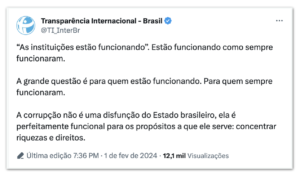 “As instituições estão funcionando. Estão funcionando como sempre funcionaram. A grande questão é para quem estão funcionando. Para quem sempre funcionaram”. “A corrupção não é uma disfunção do Estado brasileiro, ela é perfeitamente funcional para os propósitos a que ele serve: concentrar riquezas e direitos”, escreveu a Transparência Internacional em seu perfil no X, antigo Twitter.