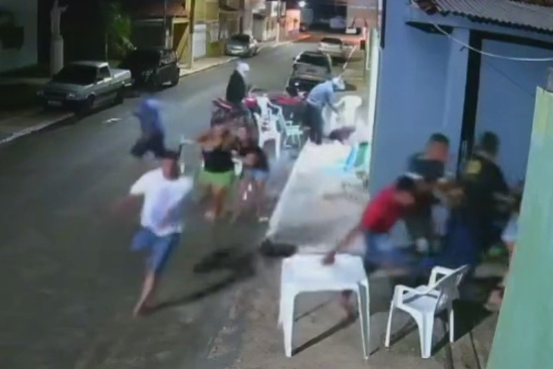 Imagens de uma câmera de segurança registraram a ação dos criminosos, que chegaram em uma motocicleta vermelha e, do meio da rua, já começam atirar na vítima.