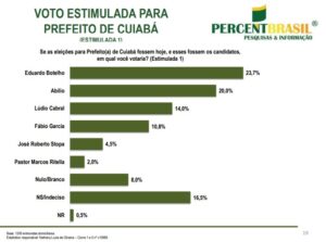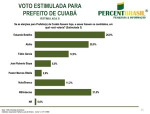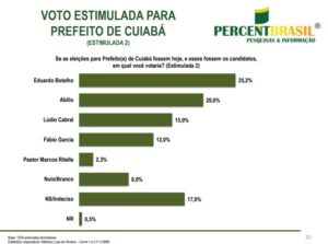 No primeiro cenário com perguntas estimuladas, Eduardo Botelho tem 23,7% e vem seguido de Abílio Brunini com 20%; Lúdio Cabral com 14%; Fábio Garcia com 10,8%. O vice-prefeito José Roberto Stopa tem 4,5% e o pastor Marcos Ritella (PTB) figura com 2%. Votam branco ou nulo 8%. Estão indecisos 16,5% e não responderam 0,5%.