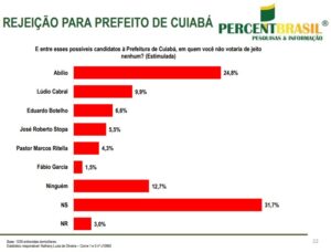 Abílio Brunini tem 24,8% de rejeição. Ele é seguido negativamente pelo candidato da esquerda e partido do presidente Lula, Lúdio Cabral, que acumula 9,9% de rejeição; na sequência vem Botelho com 6,6%; Stopa com 5,5%; Marcos Ritella com 4,3% e, se destacando como o “menos rejeitado”, Fábio Garcia aparece com apenas 1,5%.
