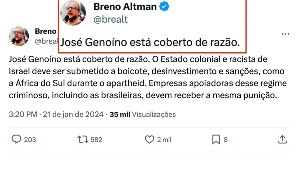 O Conselho Nacional de Direitos Humanos (CNDH), órgão colegiado composto por diversas ONGs e vinculado ao Ministério dos Direitos Humanos e da Cidadania (MDHC), publicou nota em defesa do militante de esquerda Breno Altman, que tem dado declarações antissemitas, relativizando as ações do Hamas contra Israel. A nota do CNDH se refere a uma decisão judicial de novembro desfavorável a Altman. Na ocasião, a Justiça de São Paulo atendeu à Confederação Israelita do Brasil (Conib) em pedido pela exclusão de 11 postagens do esquerdista. Nelas, Altman comparou os judeus a “ratos” e defendeu “a liquidação do regime sionista”. Nas redes sociais, o militante chamou a Conib de “valhacouto de bolsonaristas” e tem dito que a confederação atua em nome do governo de Israel.