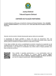 Para desmentir Edna, o vereador Dilemário apresentou uma Certidão de Filiação Partidária disponível no site do Tribunal Superior Eleitoral que comprova que o advogado Juliano Rafael Teixeira Enamoto não tem filiação ao Podemos de Cuiabá ou em nenhum outro município brasileiro.