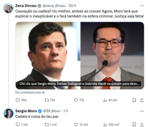 O senador Sergio Moro (União-PR) rebateu a provocação do deputado Zeca Dirceu (PT-PR), que publicou em sua rede social uma reportagem que mostra ações do Conselho Nacional de Justiça (CNJ) sobre juízes, desembargadores e procuradores que estavam à frente da Operação Lava Jato.