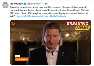 Nohynek testemunhou em 11 de abril que seu instituto avisou ao governo finlandês no final de 2021 que os passaportes COVID não faziam mais sentido, mas os certificados continuavam a ser exigidos. O jornalista finlandês Ike Novikoff noticiou o fato ontem depois de deixar o tribunal de Helsinque, onde a Dra. Nohynek discursou.