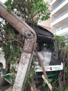 Um motorista de ônibus perdeu o controle, invadiu a pista e acabou batendo em um poste de energia e uma árvore na Avenida do CPA, em Cuiabá, na manhã desta terça-feira (23).