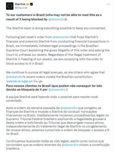 “Independentemente do tratamento ilegal dado ao Starlink no congelamento de nossos ativos, estamos cumprindo a ordem de bloqueio de acesso ao X no Brasil”, disse a empresa pela rede social.