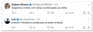 A jornalista recebeu uma chuva de críticas. Internautas chamaram Sandra de ‘hipócrita’ por ela se referir às condenações do presidente americano eleito, mas achar normal que Lula (PT), condenado em três instâncias por corrupção, ocupe a Presidência do Brasil.