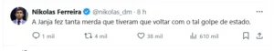 “A Janja fez tanta merda que tiveram que voltar com o tal golpe de estado”, declarou Nikolas, se referindo ao xingamento de Janja durante o G20, quando ela mandou, no idioma inglês, o dono do X, Elon Musk, ir “se foder”.