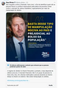 “Abri inquérito contra a chamada “Faria Lima”, a fim de identificar quem são as pessoas físicas ou jurídicas responsáveis pela prática de possíveis crimes contra o mercado de valores mobiliários, especialmente por meio da manipulação do câmbio”, escreveu o petista na rede social X.