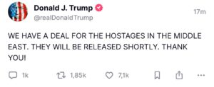 Antes mesmo da confirmação oficial, Donald Trump usou a rede social Truth Social para celebrar o fim das negociações. “Nós temos um acordo para os reféns no Oriente Médio. Logo eles serão soltos. Obrigado!”, escreveu.