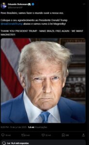 A mensagem foi acompanhada pelas frases: “THANK YOU PRESIDENT TRUMP MAKE BRAZIL FREE AGAIN WE WANT MAGNITSKY!”.