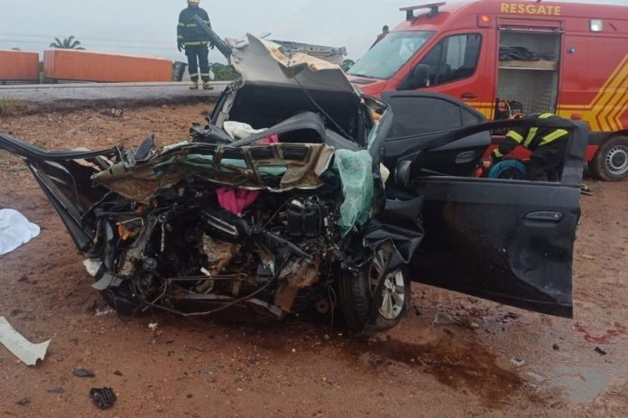 Imagens registradas por testemunhas mostram o Chevrolet Prisma com a parte frontal totalmente destruída, o que evidencia a violência do impacto. A carreta envolvida permaneceu no local até a chegada das autoridades.