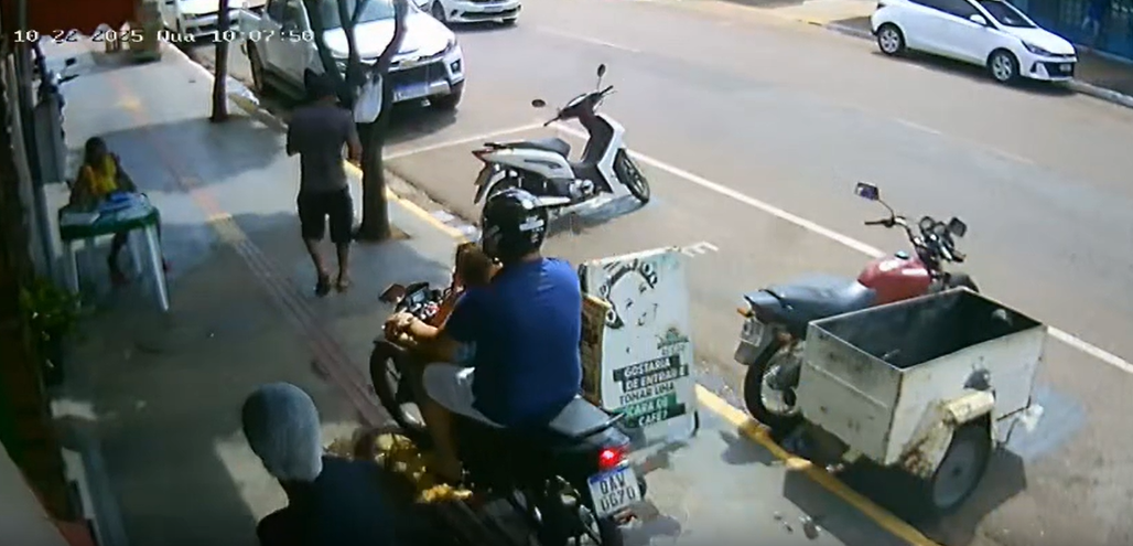 Câmeras de segurança do Centro de Rondonópolis (212 km ao sul de Cuiabá) registraram, na última quarta-feira (22), uma cena inusitada: um homem em uma moto, carregando uma criança pequena, furtando o celular de uma vendedora que estava na calçada.
