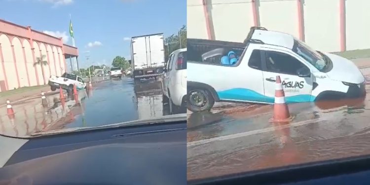 Um veículo pertencente à concessionária Águas Cuiabá ficou preso em um grande buraco que se abriu na tarde desta segunda-feira (10), na Avenida Beira Rio, em frente ao Atacadão do Porto, após o rompimento de uma tubulação de água.