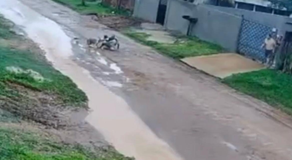 Com a violência das investidas, o idoso cai no chão, mas consegue se levantar e tentar se afastar. Um motociclista passa pelo local nesse momento, porém não presta ajuda.