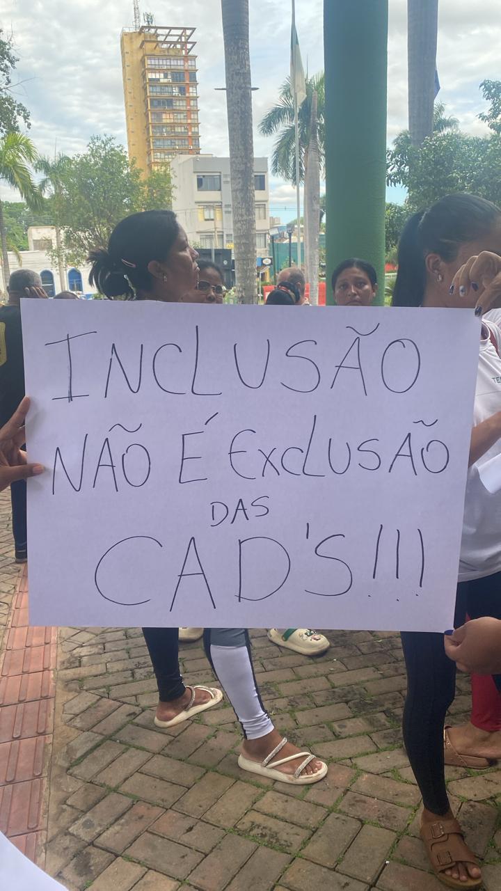 Cuidadoras de Alunos com Deficiência (CADs) realizaram um protesto na manhã desta terça-feira (18) em frente à Prefeitura de Cuiabá. O grupo buscava uma audiência com o prefeito Abílio Brunini para pedir que todas as profissionais sejam recontratadas, inclusive aquelas que não atingiram pontuação suficiente no processo seletivo simplificado já realizado pelo município.