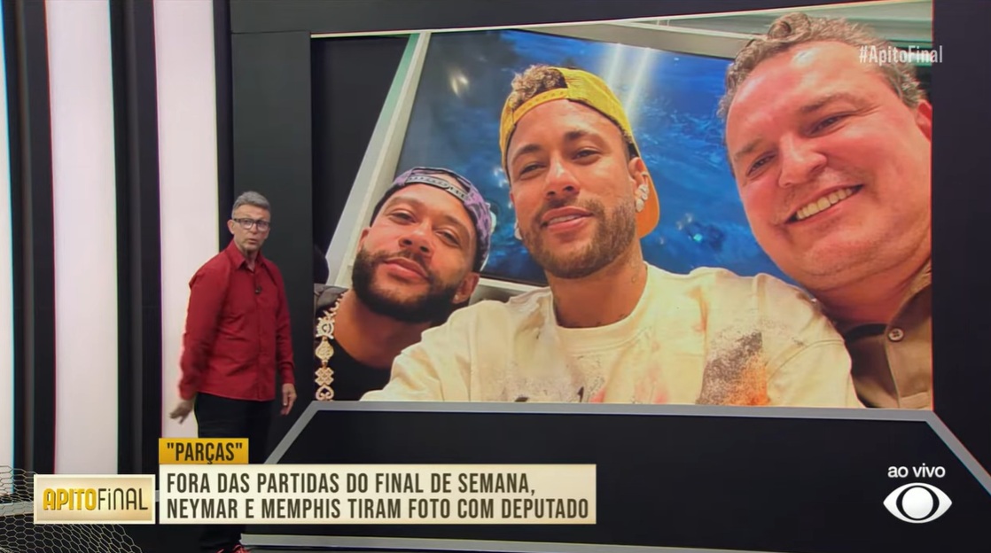 Neto comentava sobre a ausência de Neymar no próximo jogo do Santos e que, fora dos campos, ele postou uma foto com um deputado. A apresentadora Marília Ruiz explicou então que Neymar havia realizado uma festa em sua casa no Guarujá (SP) e convidou Max Russi, a quem ela se refere como pré-candidato a governador de Mato Grosso.