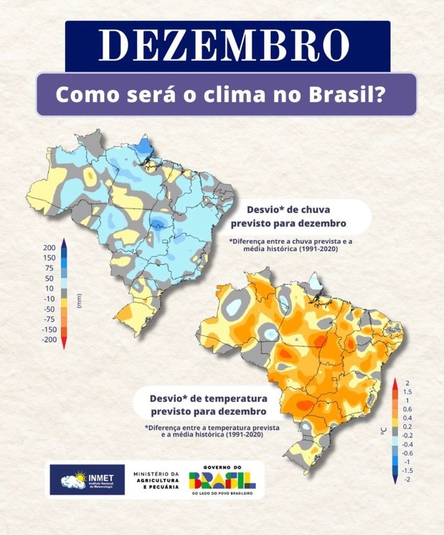 A previsão climática do Instituto Nacional de Meteorologia (Inmet) indica variabilidade em relação à chuva no Brasil durante o mês de dezembro de 2025. Em grande parte da Região Sul, as estimativas indicam chuva abaixo da média (tom em amarelo na Figura 1a). De outro modo, em diferentes áreas das regiões Centro-Oeste, Norte, Nordeste e Sudeste, são previstos volumes acima da média (tom em azul no mapa da Figura 1a).