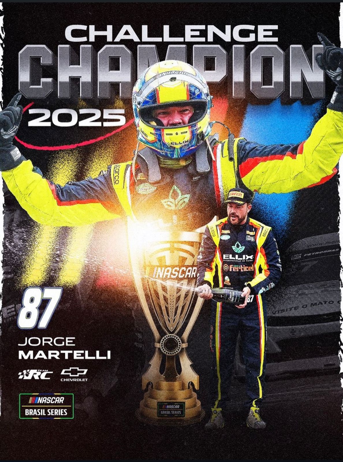 O piloto Jorge Martelli, da equipe RC e Chevrolet, é o novo campeão da NASCAR Brasil Series Challenge 2025. A conquista foi celebrada neste domingo, em grande estilo, e ganhou destaque nas redes sociais com o banner oficial que confirma o título nacional.