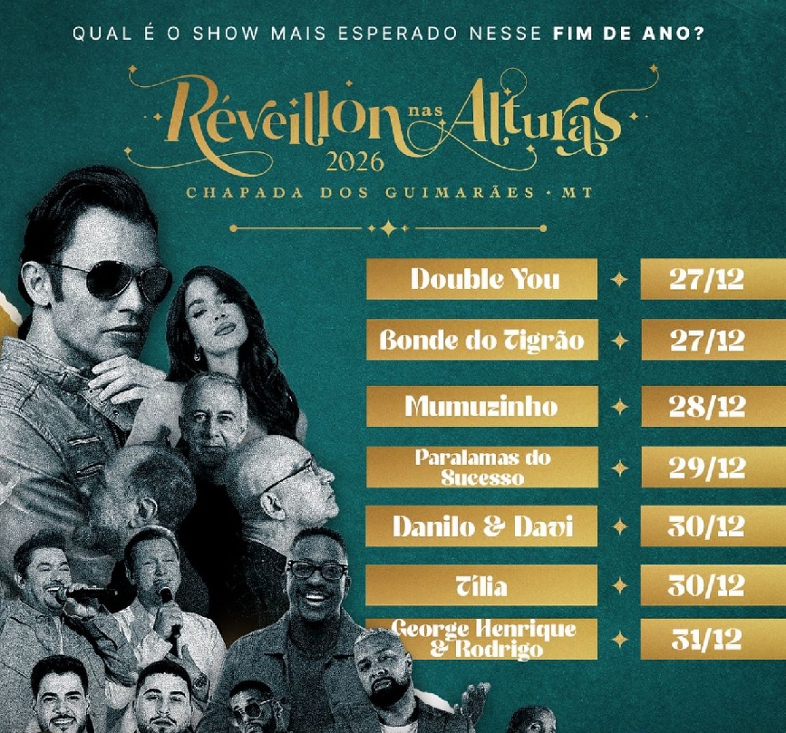 Com natureza exuberante, clima acolhedor e uma sequência de shows imperdíveis, Chapada dos Guimarães promete uma celebração única. Prepare-se: o Réveillon nas Alturas será sinônimo de música, alegria e boas vibrações para receber 2026 em grande estilo.