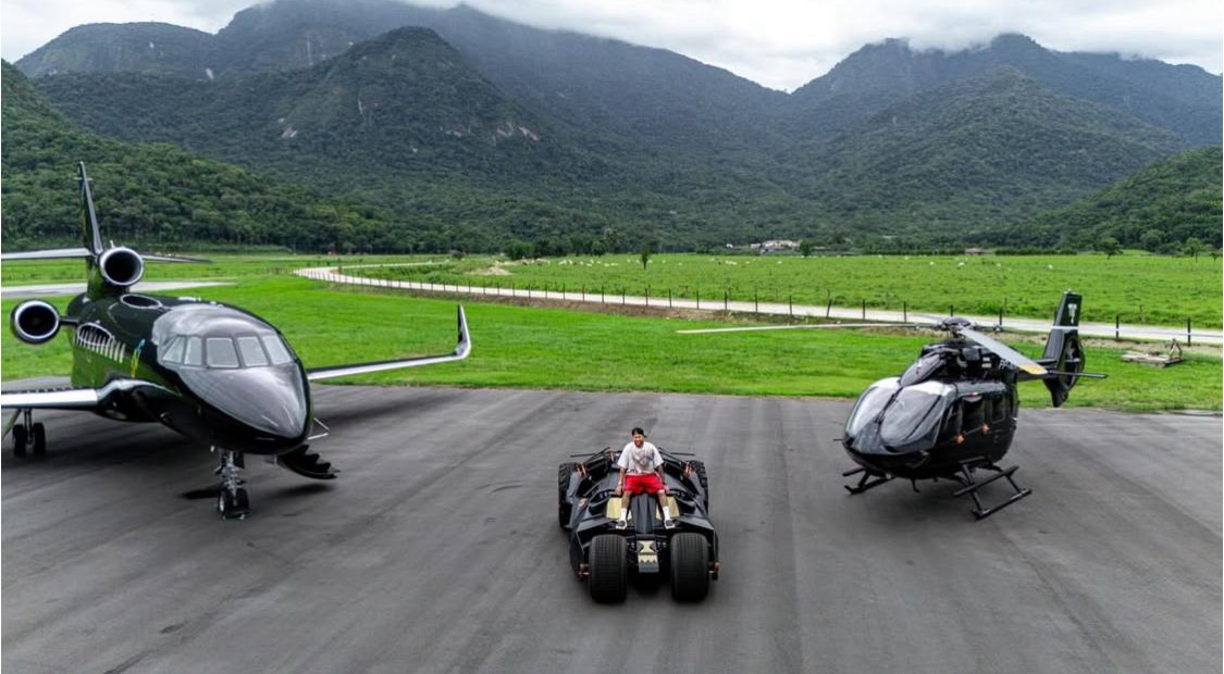 Neymar Jr. voltou a chamar atenção fora das quatro linhas nesta segunda-feira (5) ao exibir parte de sua coleção de itens de alto luxo. O camisa 10 mantém os bens em sua mansão em Mangaratiba, no interior do Rio de Janeiro, incluindo uma réplica do Batmóvel, um jato executivo e um helicóptero de padrão elevado.