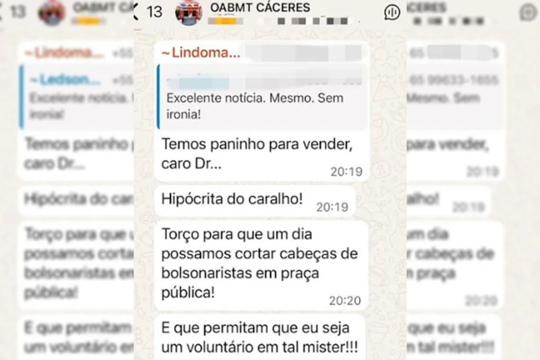 Um advogado de Cáceres (225 km a oeste de Cuiabá) causou revolta em um grupo de WhatsApp de profissionais do direito do município após fazer declarações em defesa da violência política. “Torço para que um dia possamos cortar cabeças de bolsonaristas em praça pública”, disse em uma das mensagens.