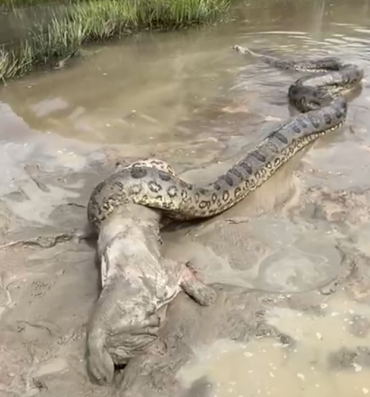 Sucuri é flagrada “abraçando” bezerro em córrego no interior de MT; Vídeo