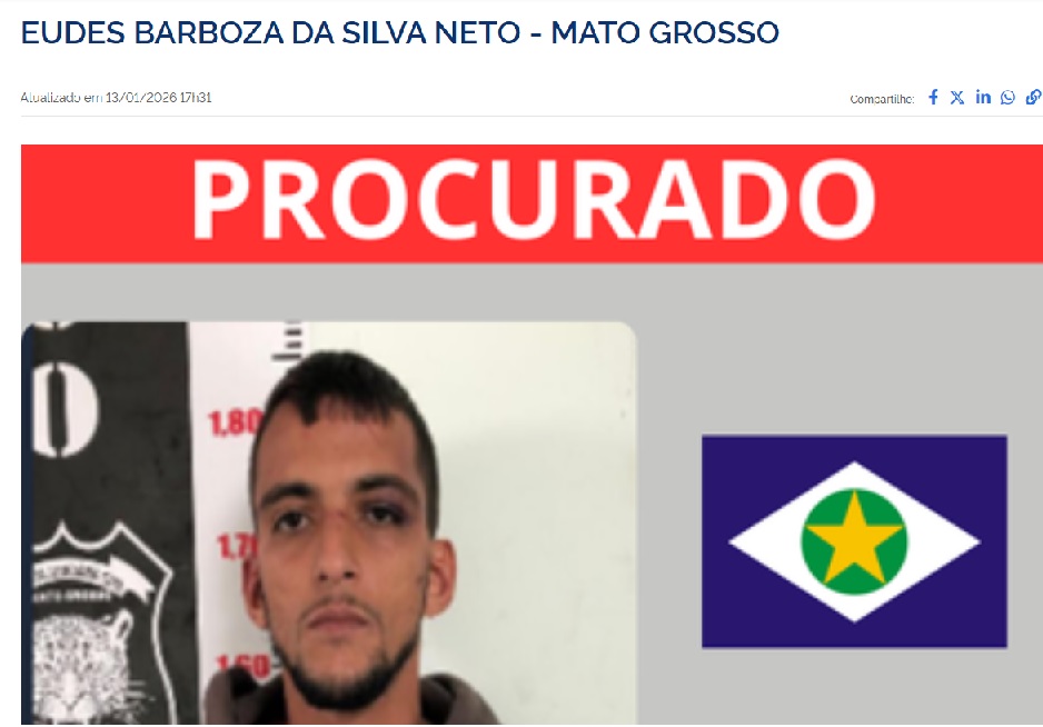 O assaltante de bancos, com atuação principalmente em ataques a carros-fortes, Eudes Barbosa da Silva Neto, conhecido como “Neto”, passou a integrar a lista dos oito criminosos mais procurados do estado de Mato Grosso. Ele consta no Projeto Capturas, iniciativa lançada recentemente pelo Ministério da Justiça e Segurança Pública.