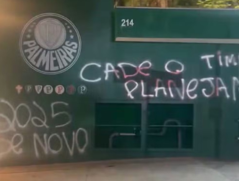 Também foram pichados os dizeres “Abel, acabou a magia? 2025 de novo” e “Cadê o planejamento? Time sem vergonha. SPAlmeiras”.