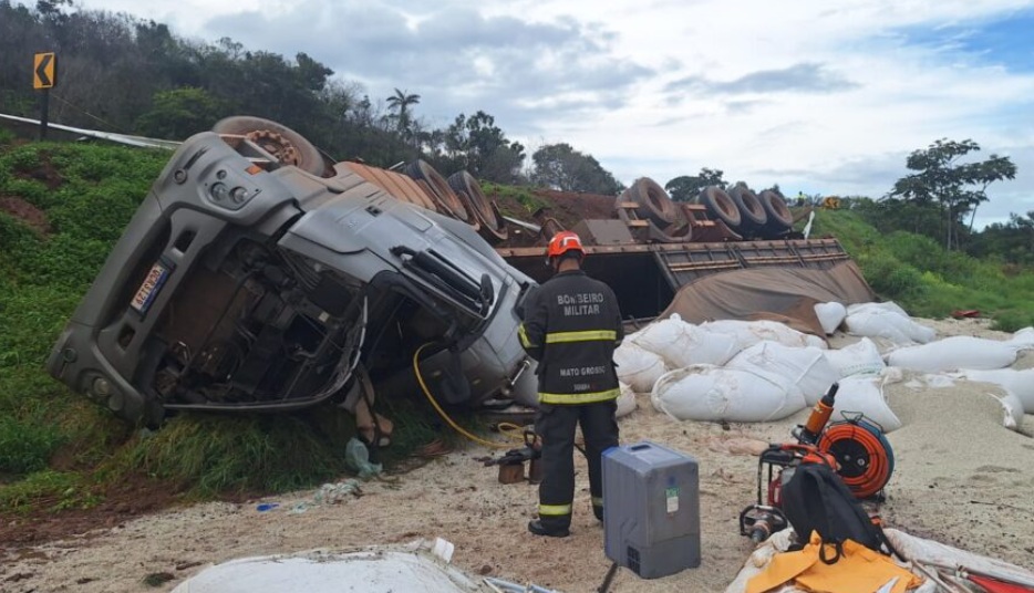Carreta com adubo tomba e motorista morre preso às ferragens na BR-163