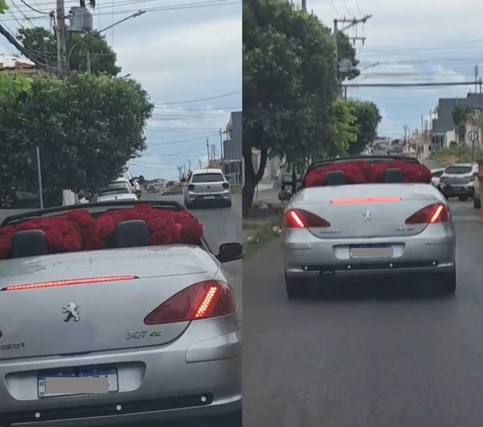 Um homem em um Peugeot 307 CC conversível fio flagrado nesta terça-feira (27) na região central de Cuiabá transportando um buquê gigante de rosas. O veículo chamou a atenção por onde passou e deixou a pergunta: quem será o destinatário do presente extravagante?