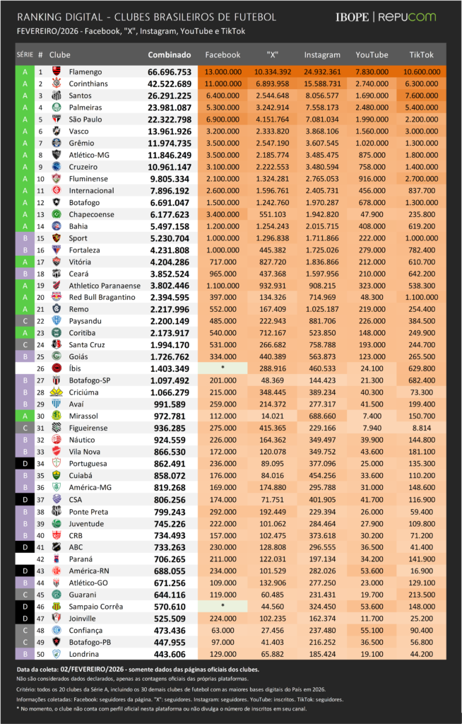 Impulsionado pelo título da Supercopa, o Corinthians foi o clube que mais cresceu no mês, com 420 mil novos inscritos, liderando o Instagram e dividindo o topo do TikTok. O Flamengo veio logo atrás, com 360 mil novos, dominando YouTube e TikTok e registrando forte avanço também no X (antigo Twitter).