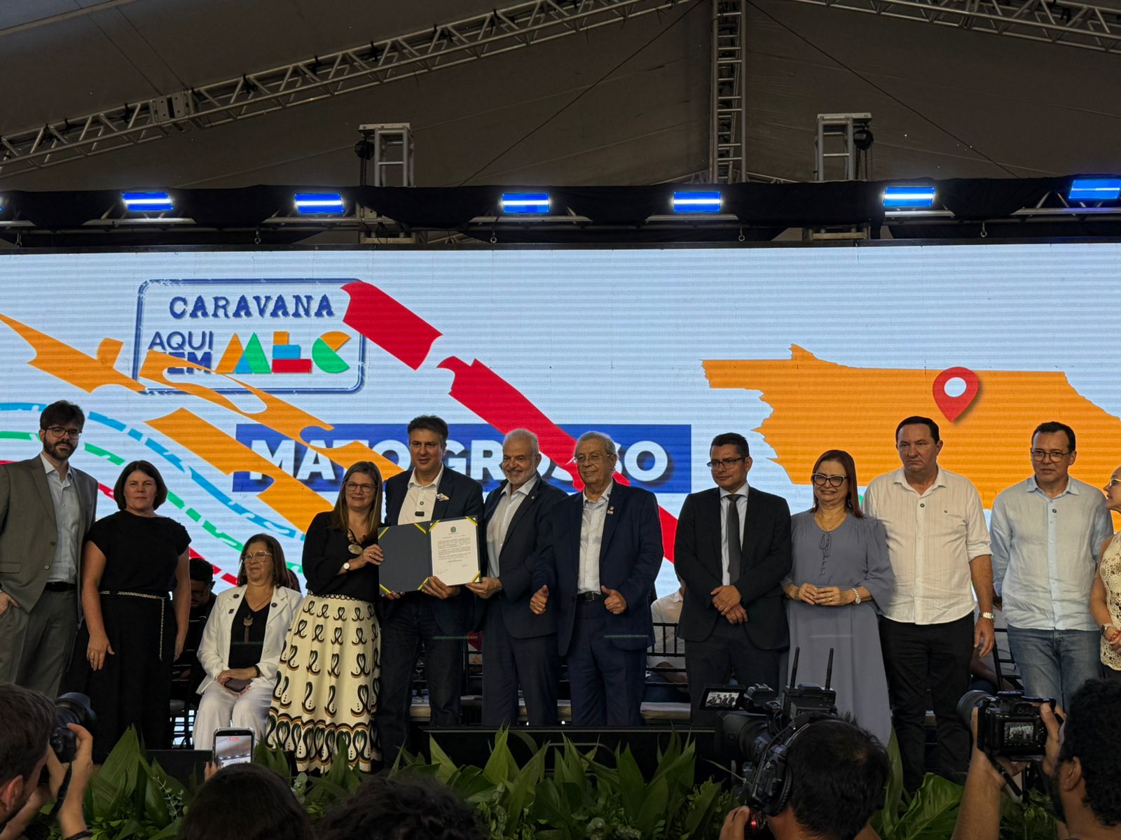 No dispositivo de honra da cerimônia que teve a entrega da Carteira Nacional Docente do Brasil e do Vale-computador, subiram ao palco o ministro, além de políticos mato-grossenses de esquerda como a ex-deputada federal Rosa Neide (PT), os deputados estaduais Valdir Barranco (PT) e Lúdio Cabral (PT), e a médica Natasha Slhessarenko (PSD).