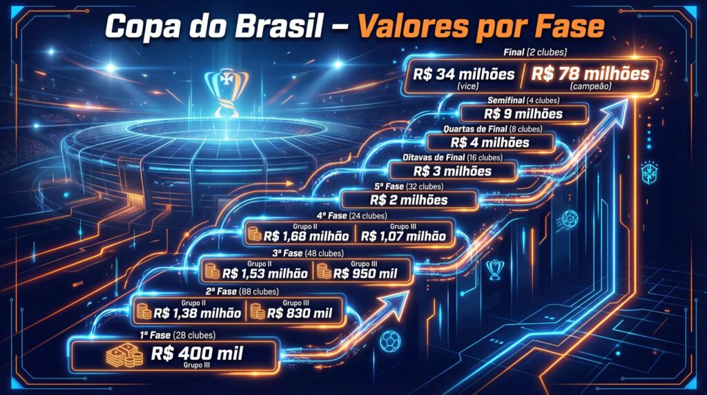 A premiação cresce a cada fase e pode chegar a R$ 78 milhões para o campeão, com possibilidade de ultrapassar R$ 90 milhões no total acumulado. A partir da quinta fase, quando entram os clubes da Série A, os valores passam a ser iguais para todos.