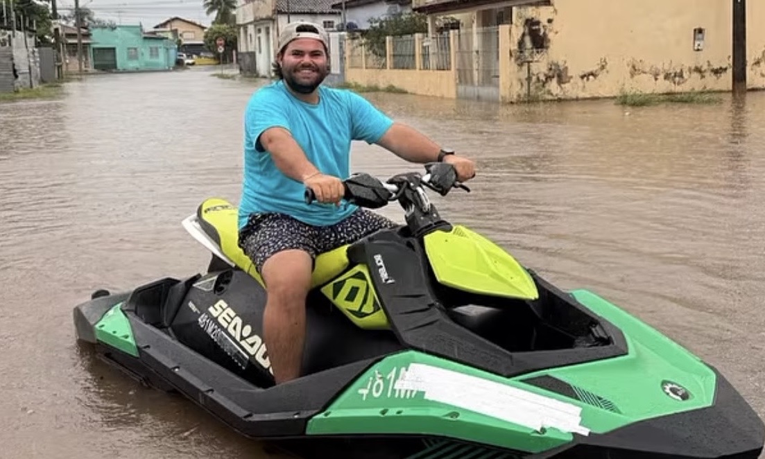 Cidade vira “balneário urbano”: sem drenagem eficiente, morador usa jet ski para ‘passear’