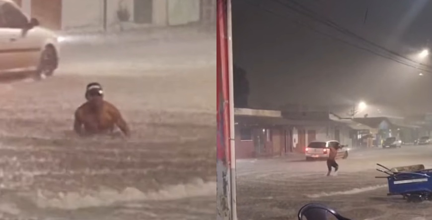 Homem aproveita alagamento para “nadar” em cidade do interior de MT; veja vídeo