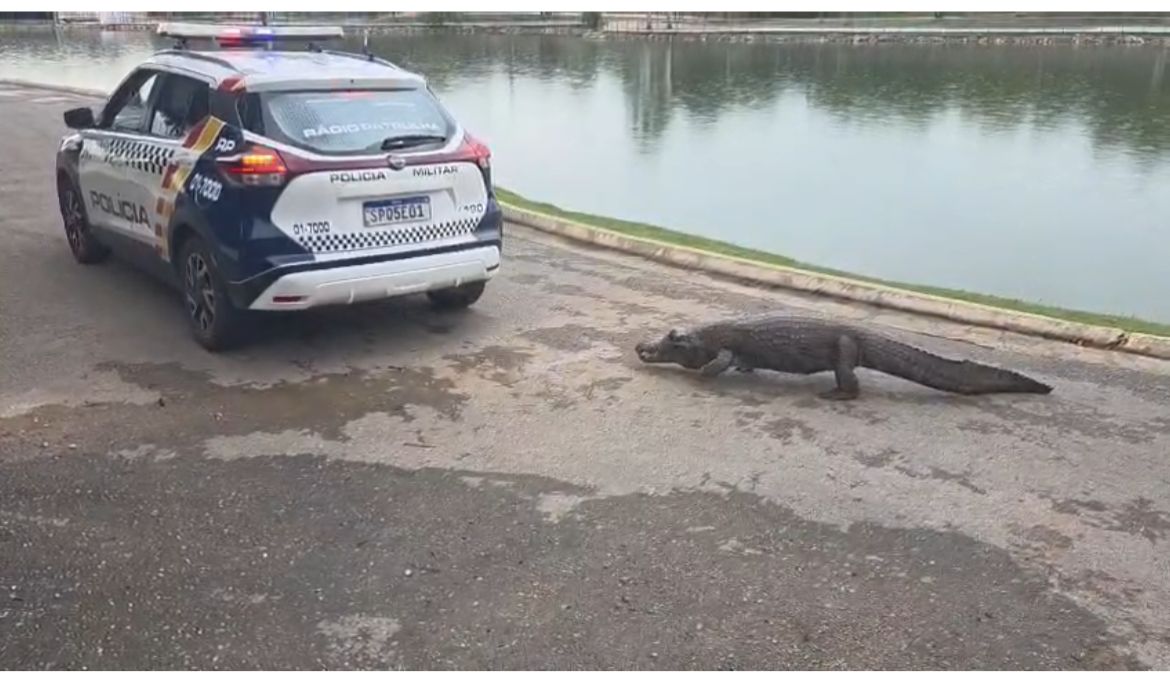 “O jacaré entrou na pista e começou a nos seguir. Foi necessário tirar a viatura do campo de visão para que ele voltasse para o lago”, explicou o comandante.