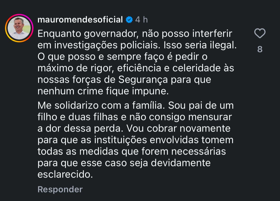 Em publicação, o chefe do Executivo estadual afirmou que não pode interferir diretamente nas investigações, mas garantiu cobrança por celeridade. “Enquanto governador, não posso interferir em investigações policiais. Isso seria ilegal. O que posso e sempre faço é pedir o máximo de rigor, eficiência e celeridade às nossas forças de Segurança para que nenhum crime fique impune”, declarou. Ele também prestou solidariedade à família e disse que voltará a cobrar providências para o esclarecimento do caso.
