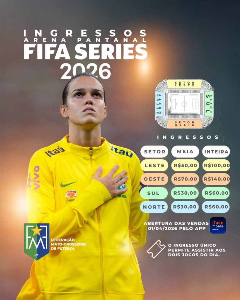 Cuiabá entra de vez no mapa do futebol internacional. A venda de ingressos para o FIFA Series Feminino 2026 começa na próxima quarta-feira (01), colocando a capital mato-grossense na rota de grandes seleções e jogos de alto nível. As partidas serão disputadas na Arena Pantanal, com entradas comercializadas exclusivamente pelo aplicativo Facepass e preços variando por setor: Leste (R$ 50 meia / R$ 100 inteira), Oeste (R$ 70 / R$ 140) e Norte e Sul (R$ 30 / R$ 60).