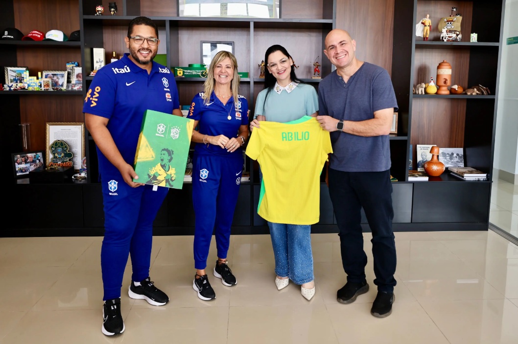 Nesta quarta-feira (8), a coordenadora de Seleções Femininas da CBF, Cris Gambaré, participou de uma reunião institucional ao lado do presidente da Federação Matogrossense de Futebol (FMF) e chefe de delegação da Seleção Brasileira, Diogo Pécora, e do prefeito de Cuiabá, Abilio Brunini. O encontro realizado na sede da Prefeitura de Cuiabá teve como objetivo alinhar ações relacionadas à disputa do FIFA Series na Arena Pantanal e discutir iniciativas voltadas ao fortalecimento do futebol feminino na região.