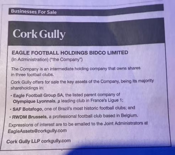 A SAF do Botafogo está à venda. O anúncio foi feito pela Cork Gully, nova adminstradora da Eagle Football, através do jornal britânico Financial Times.
