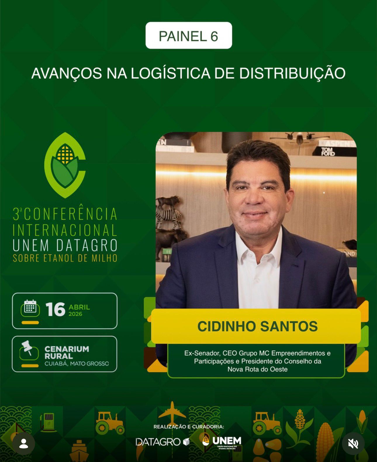 “Satisfação em confirmar minha participação como palestrante na 3ª Conferência Internacional UNEM DATAGRO sobre Etanol de Milho, que acontece nesta quinta-feira – 16/04, em Cuiabá. O evento reúne os principais líderes, especialistas, produtores e investidores do setor para debater as tendências do mercado de etanol de milho, com foco em sustentabilidade, inovação, transição energética e competitividade. Vamos discutir os “Avanços na Logística de Distribuição” no Painel 6 do evento, as 16h, juntamente com Fernando Dihel da Ultracargo e meu amigo e ex-diretor do DNIT Luiz Antonio Pagot, com moderação do Edeon Vaz, diretor do Movimento Pró Logística de MT”, disse Cidinho.