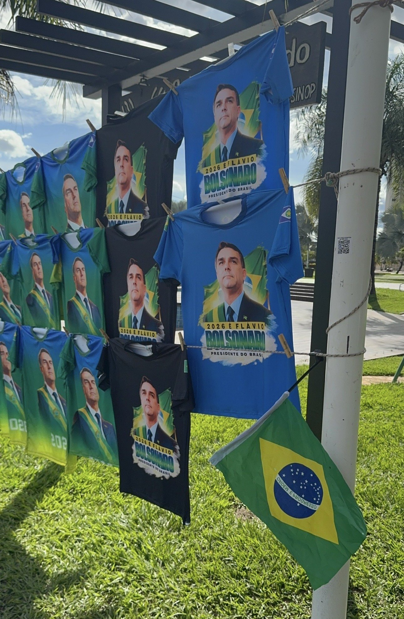 Às vésperas da visita do presidenciável Flávio Bolsonaro à Norte Show, em Sinop, ambulantes aproveitam a movimentação para reforçar a renda com a venda de bonés, camisetas, bandeiras e outros itens personalizados com o nome e foto do pré-candidato.